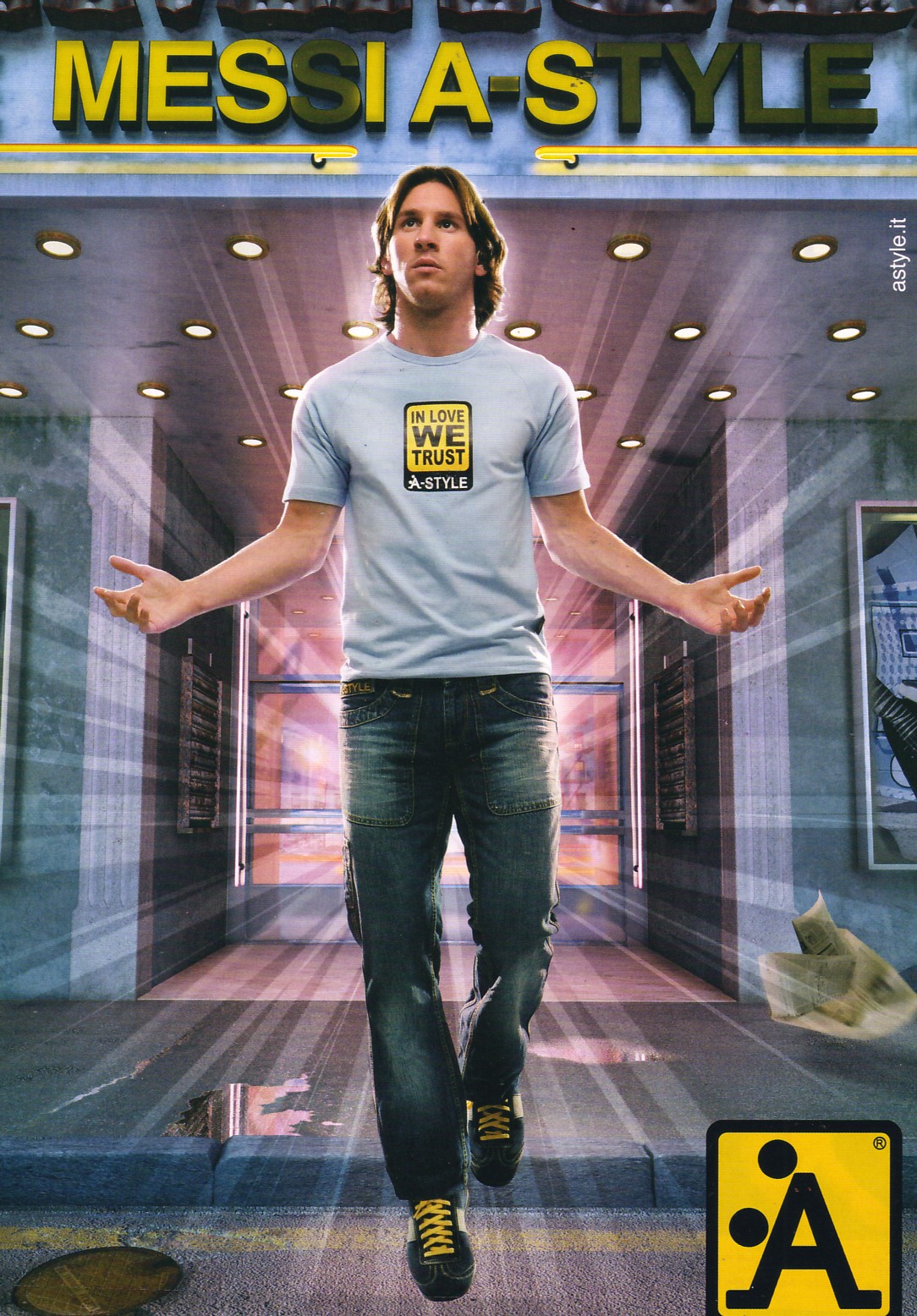 Con el fin de convencernos de este milagro, a la marca MESSIAS-STILE se le ocurrió que podría oscurecer la ‘S’ y el guion del nombre para que los lectores pudieran ver de modo destacado y con las letras en amarillo el término MESIAS, como si el jugador fuera un profeta que baja del cielo (o sube hacia él) para ofrecernos una buena nueva a todos los mortales.