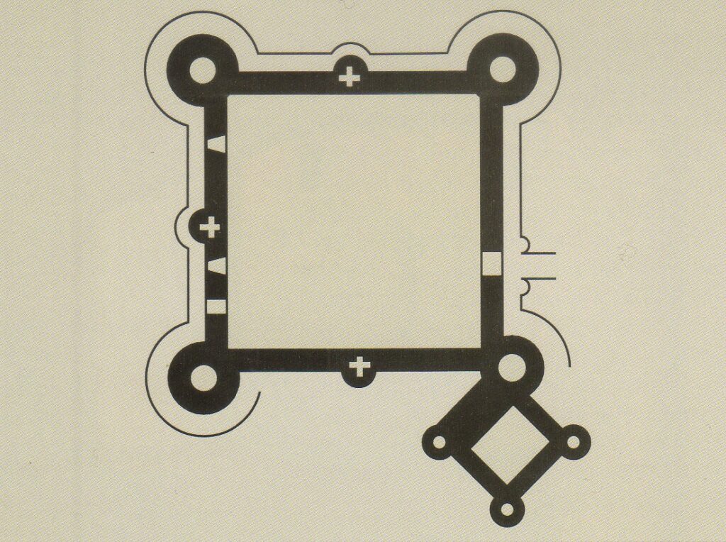 Como podemos observar por el plano de planta, tiene una forma totalmente cuadrada, con elevadas torres cilíndricas en tres de sus ángulos, de modo que en el cuarto se encuentra la torre del homenaje, que presenta la particularidad de no estar dentro de la fortaleza, caso del castillo de Alburquerque, sino en una esquina que es tangente a ella.