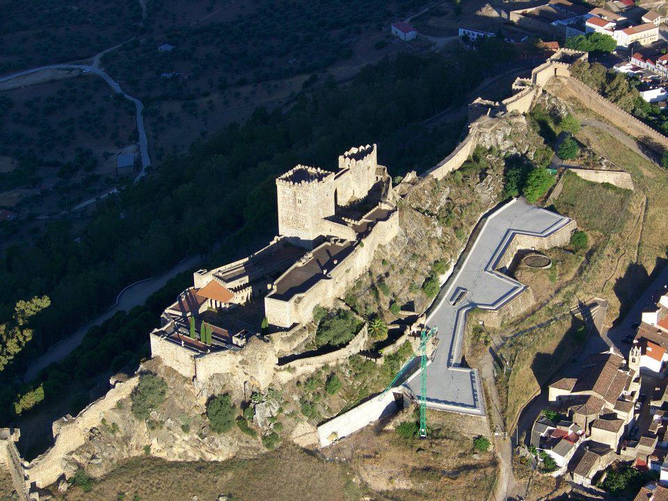 La parte alta se completa con una serie de dependencias, entre las que destaca el Palacio del Duque, conocido también como Casa del Gobernador, y las dos torres defensivas más importantes de la fortaleza: la del Homenaje, mandada a construir por Álvaro de Luna (1445-1453), y la de las Tres Esquinas o de los Cinco Picos, levantada por Beltrán de la Cueva (a partir de 1472), primer Duque de Alburquerque, a la que se accede por la Torre del Homenaje a través de un corredor de tránsito con arco apuntado.