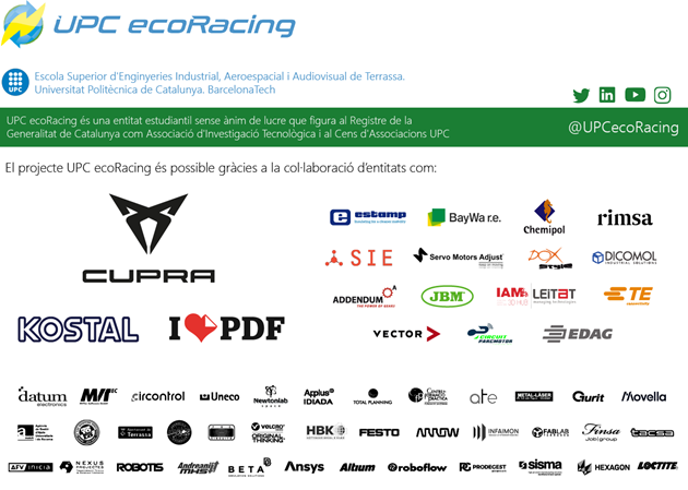 UPC ecoRacing [i]es una asociación tecnológica formada mayoritariamente por estudiantes de la Universidad Politécnica de Catalunya (UPC – ESEIAAT) que tiene como objetivo principal diseñar y fabricar monoplazas de competición para participar en la Formula Student.