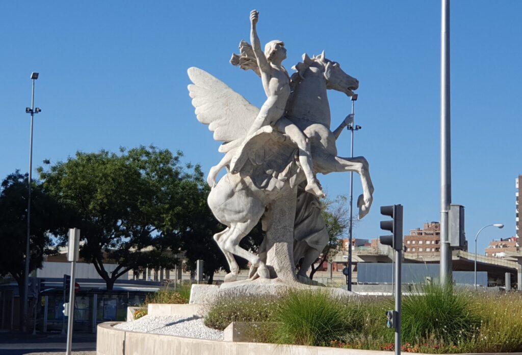Suelen realizarse en piedra blanca las esculturas que tienen un carácter alegórico, como es la que acabamos de ver que se encuentra en la Plaza de Legazpi de Madrid. Hay que considerar que este tipo de obra tiene un peso enorme, pues la piedra es esculpida, de modo que acaban siendo enormes moles macizas. En este caso, y puesto que el caballo alado se alza intentando elevarse, dado el carácter simbólico del conjunto, es necesario crear un soporte debajo del caballo para que pueda sostenerse.