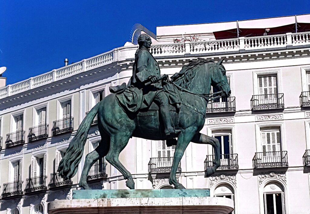 Todos sabemos que el centro de la ciudad es la Puerta del Sol, lugar emblemático por excelencia. Allí se encuentra la escultura dedicada a la figura de Carlos III, quien fuera rey de España desde 1759 hasta su fallecimiento en 1788. Conocido popularmente como “El mejor alcalde de Madrid”, en reconocimiento a su empeño en la mejora de la ciudad, se le recuerda en una escultura en bronce, de tamaño natural, montado sobre un caballo que camina apoyado en tres patas, dado que alza la izquierda delantera como si caminara.