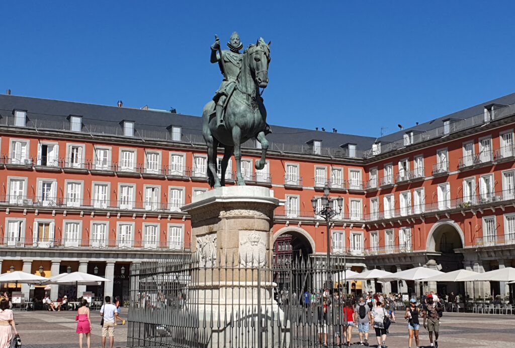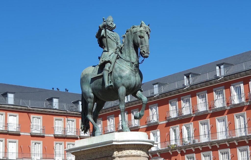 Muy cerca de la Puerta del Sol se encuentra la Plaza Mayor, otro espacio relevante de la ciudad. Una vez que se accede, tras pasar por debajo de alguna de las arcadas que la rodean, en pleno centro de la plaza se alza sobre un enorme pedestal la monumental escultura ecuestre de Felipe III, hijo de Felipe II y de Ana de Austria. Y cuando digo monumental no exagero, puesto que su tamaño es enorme, tal como puede comprobarse por la segunda fotografía que muestro.