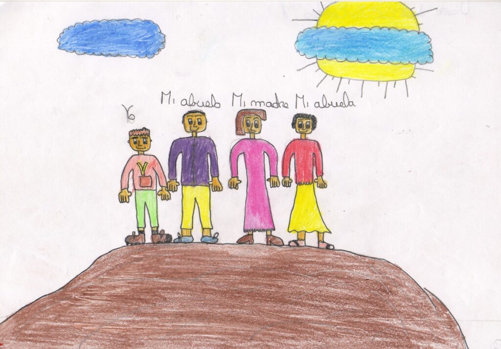 En esos momentos en la pantalla está el dibujo de un chico de 8 años que aparece con sus abuelos y su madre trazados sobre una montaña, formando un grupo cohesionado, al tiempo que no aparece la figura paterna.