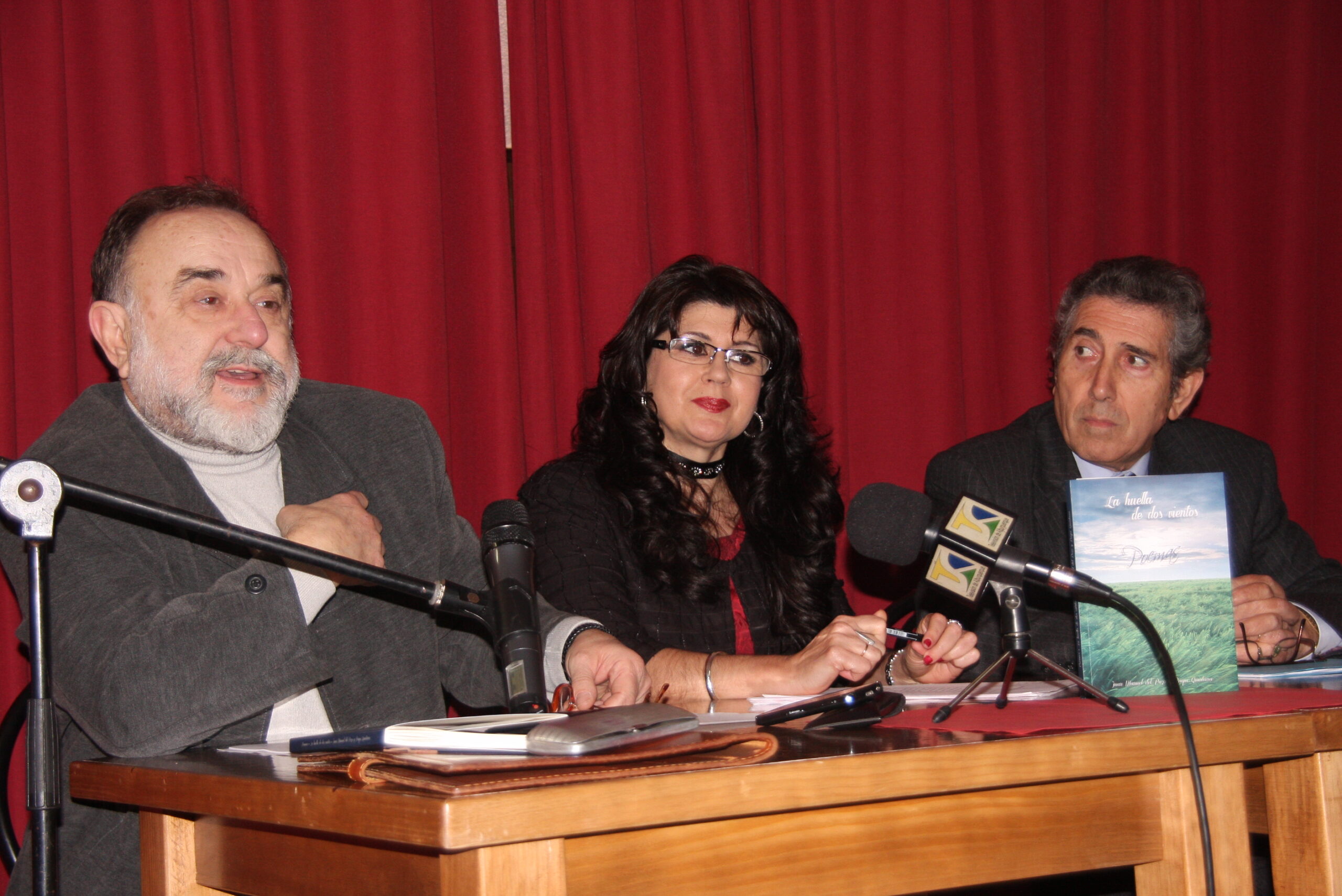 PORTADA: Francisca Quintana, Manuel del Pozo y José Manuel de Uña, en la presentación del poemario “La huella de dos vientos”, en Alburquerque.