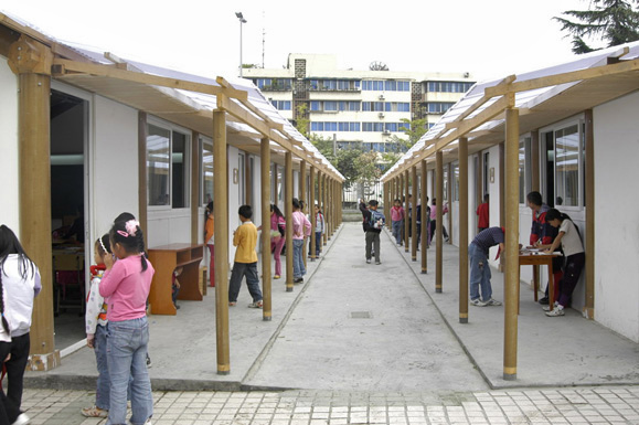 Tras esta enorme tragedia, los alumnos de un centro de investigación dirigido por el arquitecto japonés y el laboratorio de la Universidad de Keio diseñaron y emplearon tubos de cartón con tratamiento ignífugo también para construir escuelas temporales cerca de la ciudad.