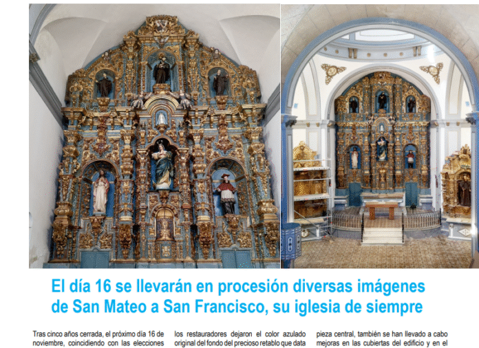 En ese mismo número escribíamos acerca de que esa procesión podría ser histórica; sin embargo, según nos comentan en San Francisco, se ha decidido suspenderla debido a que, lamentablemente, no había cargadores suficientes para llevar todas las imágenes. De esta forma, ese próximo domingo se celebrará una misa para conmemorar que el templo vuelve a esta abierto al culto después de cinco años largos. La misa la oficiará el arzobispo de Mérida-Badajoz, José Rodríguez Carballo y será a una hora intempestiva, las 14.00, debido a que el arzobispo tiene la agenda completa y no podía desplazarse antes a Alburquerque.