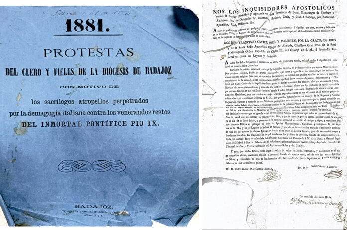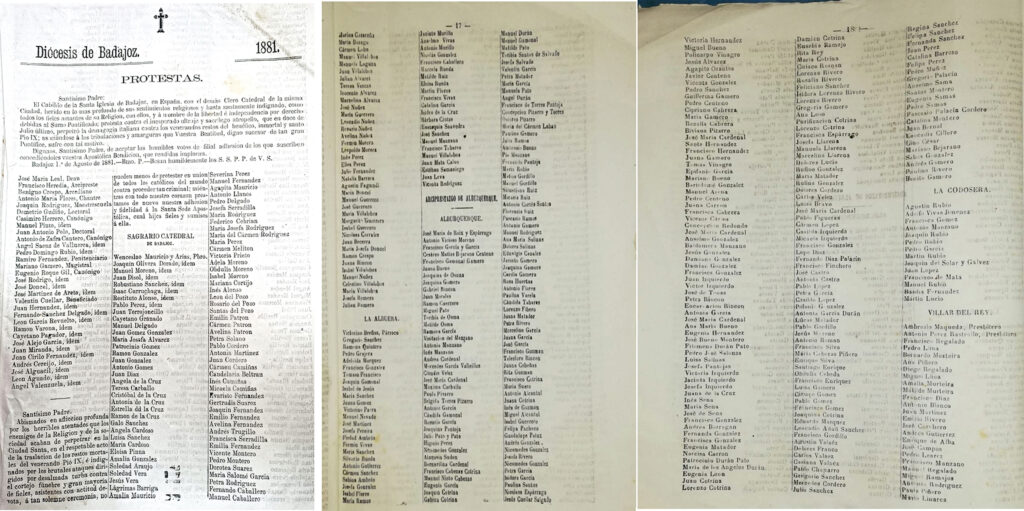 Este secular enfrentamiento ha dado lugar a lo largo de la historia a continuas ofertas de perdón, de una iglesia siempre vigilante, para aquellos miembros de las logias que abandonasen su errónea conducta, pero también a actos de audacia rayana a lo sacrílego por parte de estos últimos. Toca preguntarnos ahora, hechos tan lejanos ¿tuvieron eco o repercusión en Alburquerque? Por supuesto, convocados los fieles por todas las diócesis, arzobispados y cabildos catedralicios de los países católicos, fueron llamados a sumarse a la protesta contra el inesperado ultraje y sacrílego atropello y ofrecer sus votos de filial adhesión al Santísimo Padre, implorando, rendidos, su Apostólica Bendición. En los siguientes documentos se muestra el listado de los que concurrieron, entre otros, por Alburquerque.