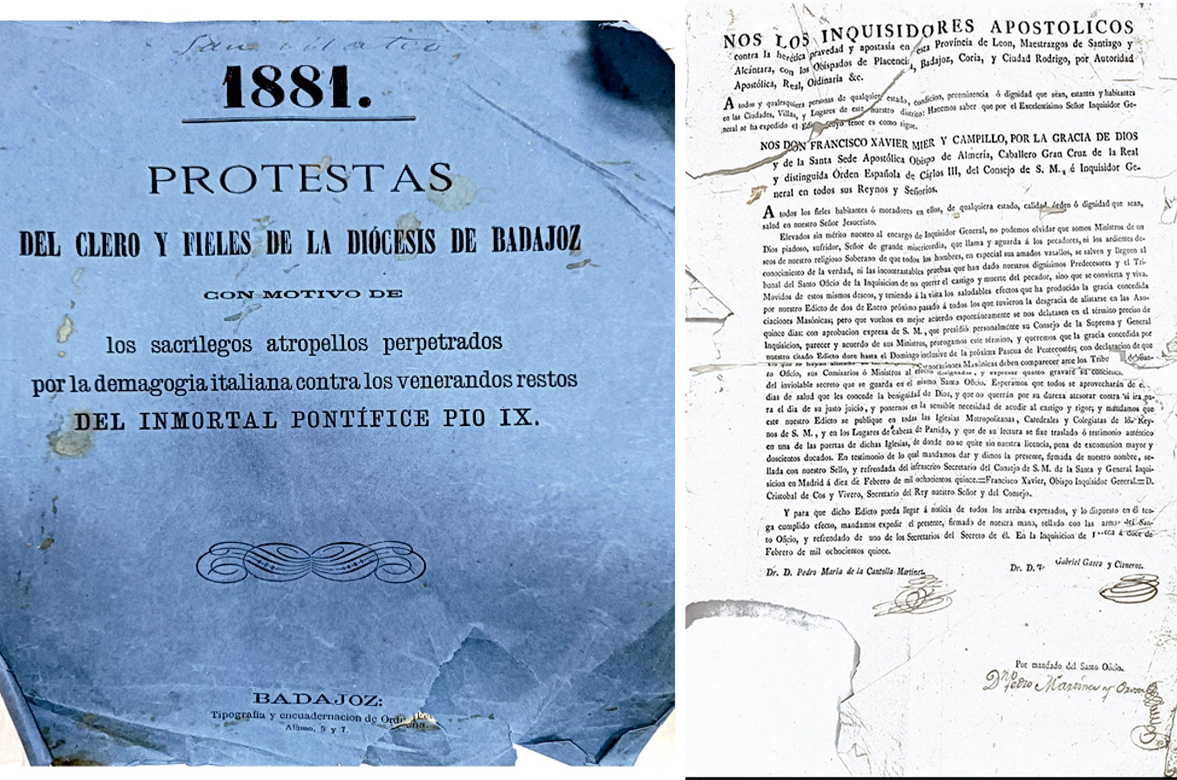 PORTADA: Protesta del clero y la diócesis de Badajoz y edicto ofreciendo el perdón a los masones que muestren arrepentimiento y cesen su militancia.