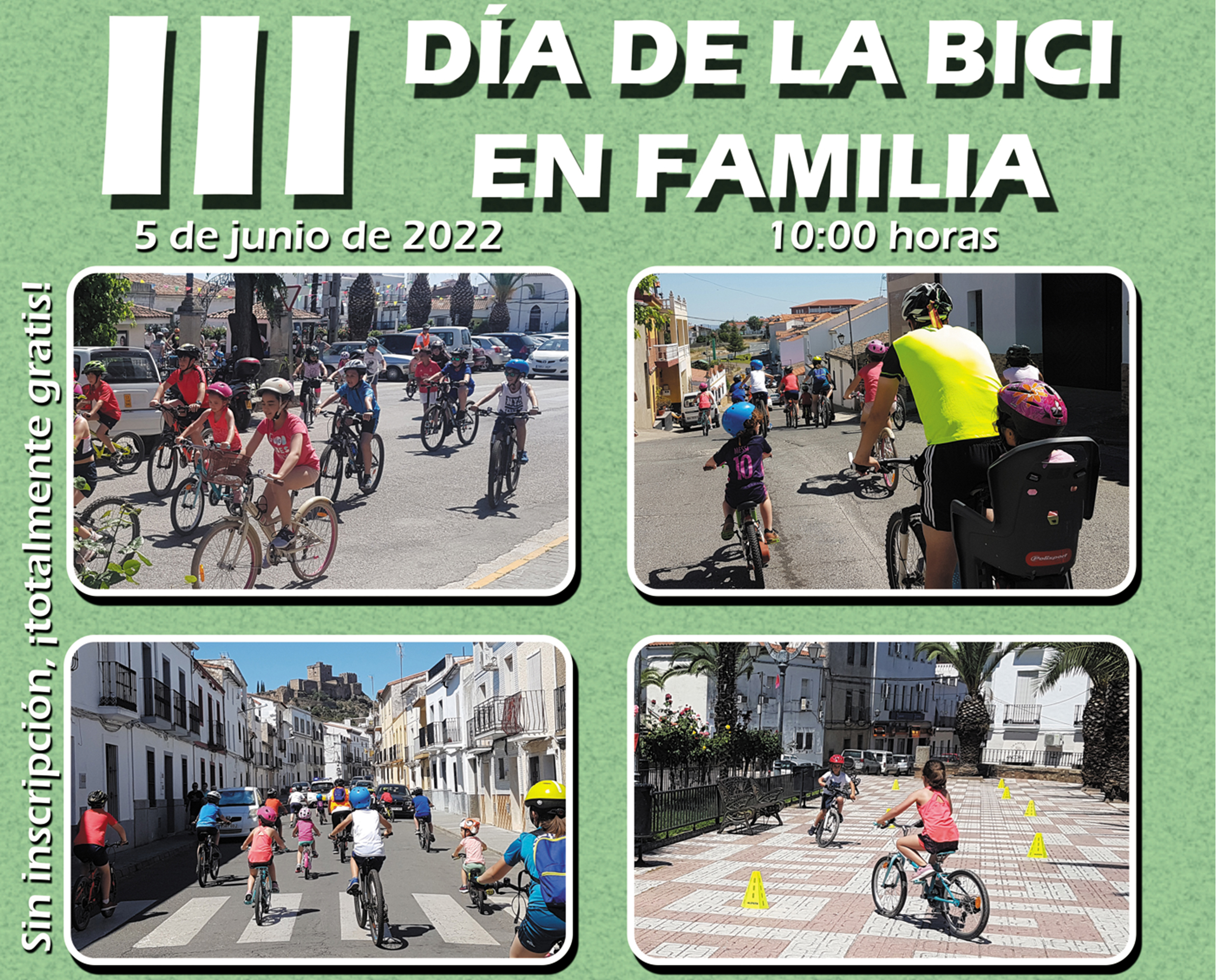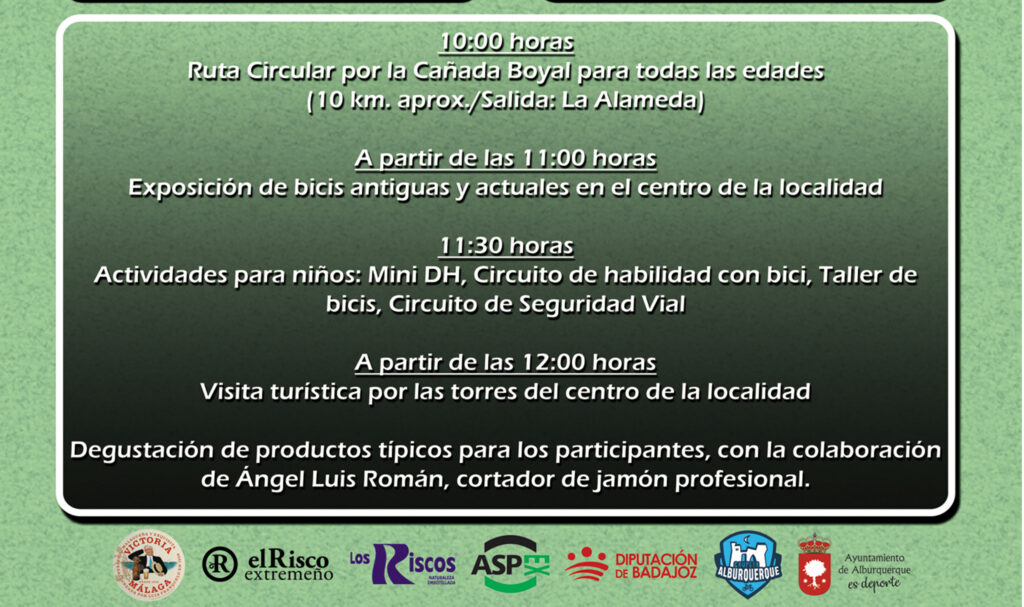 Organizada por la asociación local Grupeta de Alburquerque, con la colaboración del Patronato Municipal de Deportes de la localidad, y financiado por Diputación de Badajoz, el próximo día 5 se celebra el Día de la Bicicleta en Familia, acontecimiento que cumple su tercera edición tras un par de años si poder llevarse a cabo por motivo de la pandemia. La jornada dará comienzo en el centro de la localidad a las 10:00 horas de la mañana con la actividad principal, una ruta cicloturista circular con recorrido de unos 10 km. aproximadamente y con una dificultad apta para todo tipo de público, desde niños hasta abuelos.