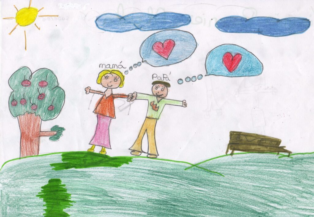 En algunos casos se sienten tan confiados de que sus padres están muy enamorados que, como acontece con el niño que realizó el dibujo que acabamos de ver, pueden aparecer sus figuras dibujadas con un globo de cómic cada uno de ellos pensando con un corazón en su interior, como representación de que se quieren mucho.