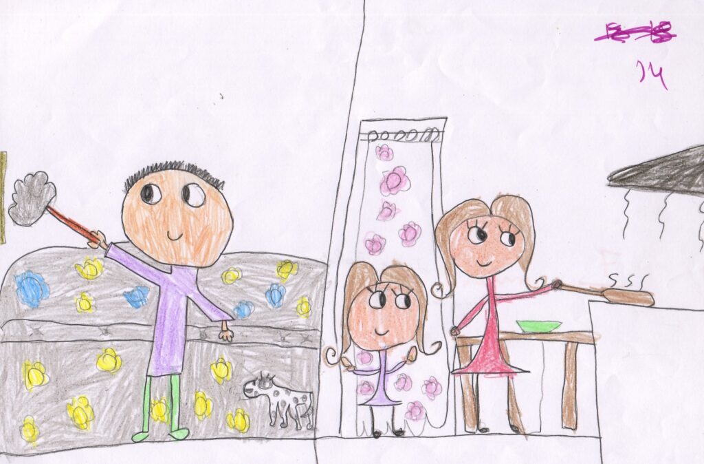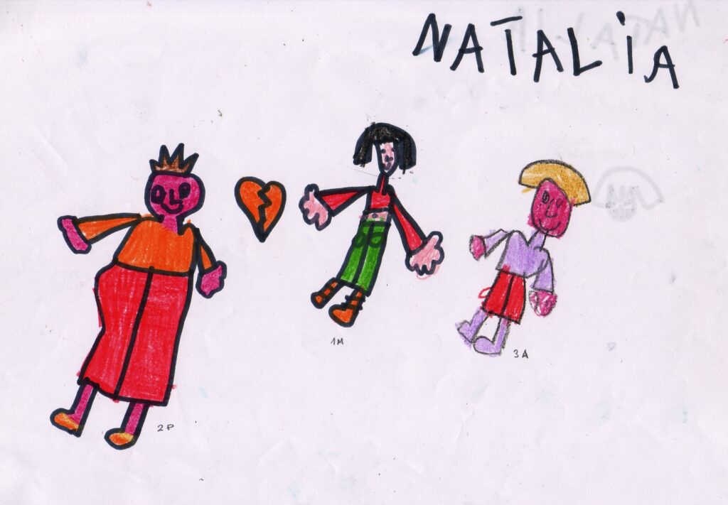 Más difícil de entender la separación es para esta niña de origen chino, también de 5 años, que fue adoptada. Lo cierto es que a las figuras de sus padres y a la de ella misma las dibuja sin brazos, como si el amor entre ellos y hacia ella hubiera desaparecido de pronto, puesto que la ausencia de brazos, en este caso, significa la falta de cariño, ya que sin brazos no pueden abrazarse. Sin embargo, a su hermana mayor sí se los dibuja, quizás porque sea quien le proporciona el afecto que tanto necesita.