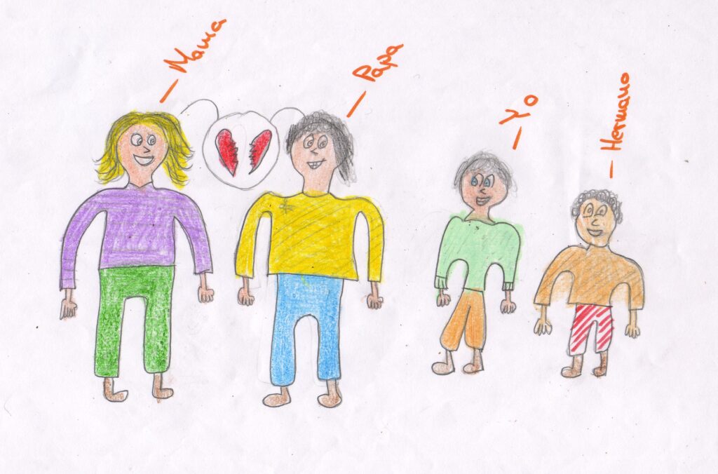 Lógicamente, por su parte, los hijos tendrán que asumir que sus padres ya no se quieren. Dura tarea para ellos, pues, como bien representa la niña de ocho años que realizó el dibujo anterior, en el que expresaba que sus padres se querían mucho trazándoles un corazón entre ellos como expresión de ese amor, en el caso de que se rompiera la relación. tendría que asumir que ese cariño que ella veía tan natural se ha transformado en una relación fría y distante, sin comprender las razones por las que ahora tienen que cambiar de modo de vida.