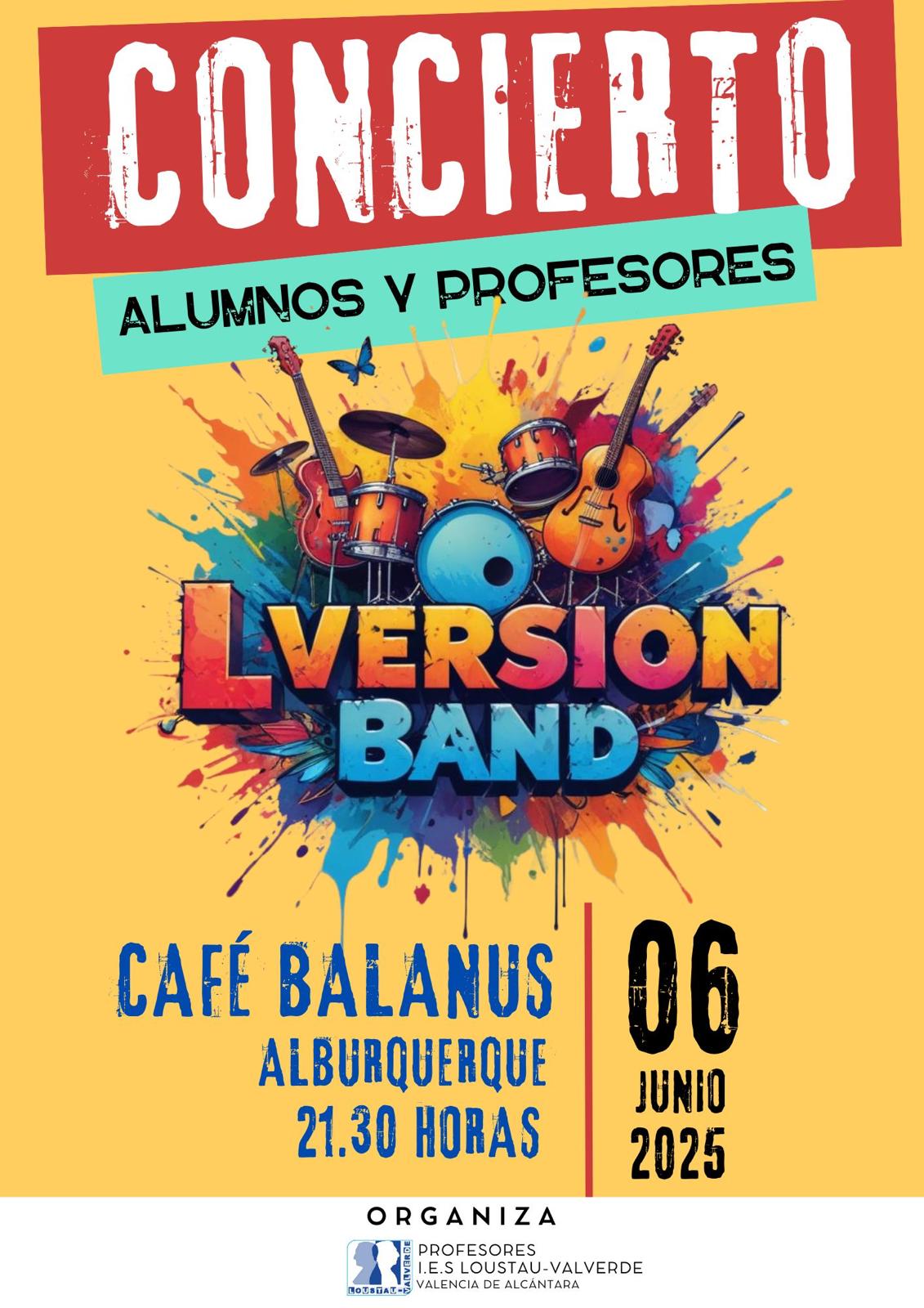 L Version Band es un proyecto promovido por el Departamento de Música del IES Loustau-Valverde de Valencia de Alcántara, en el que colaboran y participan profesores y alumnos. El objetivo del proyecto es acercar el mundo de la música a los alumnos para que la disfruten, la valoren y sientan que son parte importante de la comunidad educativa. Durante el curso los alumnos han aprendido a tocar instrumentos, a montar versiones y a actuar en público. La parte final del proyecto consiste en realizar dos actuaciones fuera del ámbito escolar. La primera de ellas fue el viernes 30 de mayo en Valencia de Alcántara, la segunda será en Alburquerque este viernes, 6 de junio en café Balanus a las 21:30.