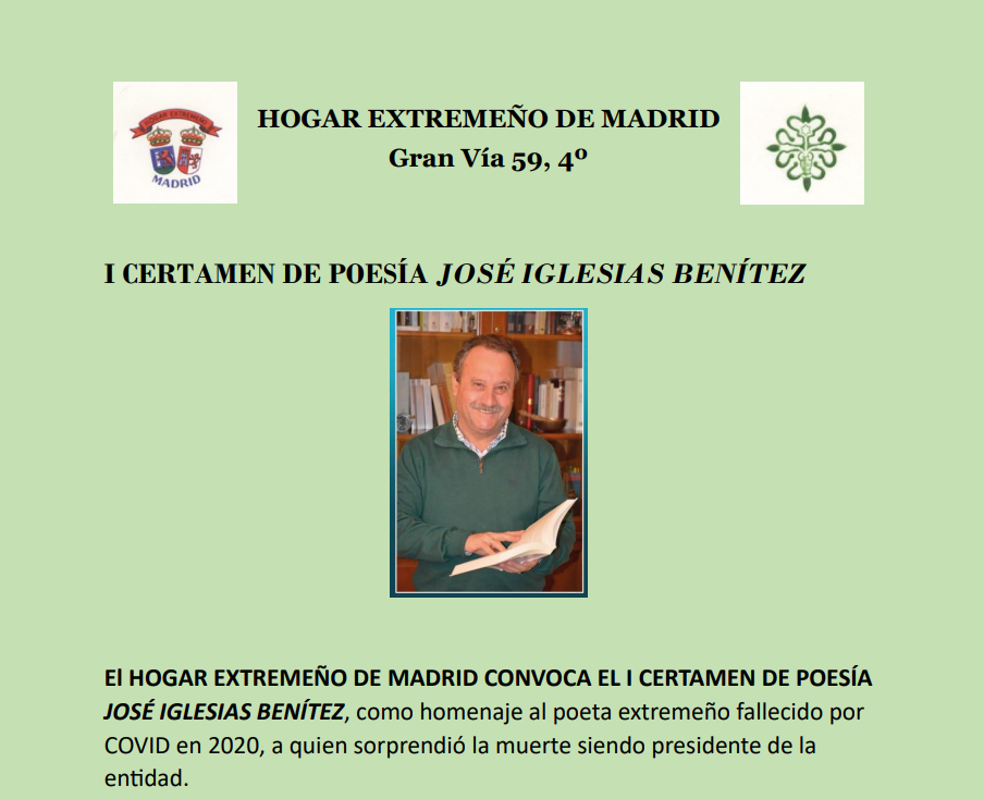 El Hogar Extremeño de Madrid ha convocado el I Certamen de Poesía José Iglesias Benítez, en homenaje a este poeta extremeño fallecido en 2020, cuando era presidente de dicha entidad.