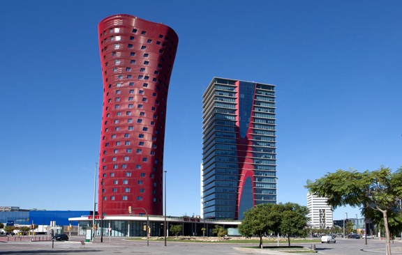 De todos modos, la obra que más sorprende del arquitecto japonés es la que proyectó en L’Hospitalet de Llobregat -ciudad prácticamente unida a Barcelona-, en una de las zonas de mayor desarrollo: el hotel Porta Fira. Su forma recuerda a la del tronco de un árbol, de modo que a lo largo de sus 113 metros de altura se van formando de modo creciente las 26 plantas, cada una diferente a la anterior, manteniendo cierta similitud a las secciones que se obtienen cuando se corta un árbol. Desde el exterior lo que se aprecia son los tubos de aluminio de color rojo unidos por rótulas a la estructura del edificio adaptándose a la superficie de la fachada en una especie de movimiento de rotación y de crecimiento hacia arriba.